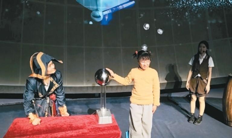 小游客(右)在陕西自然博物馆参加夜间科普互动活动 首席记者 孙欢 摄