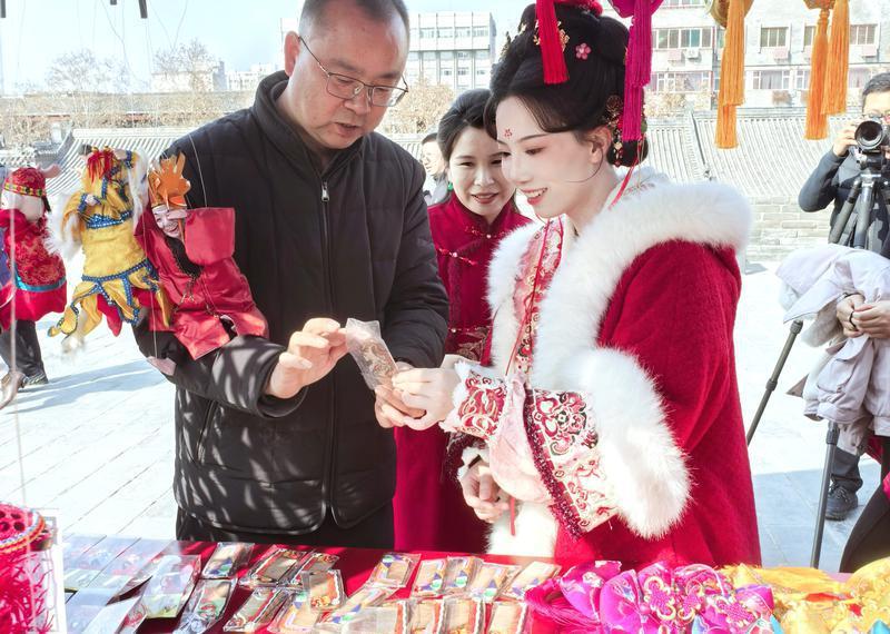 活动现场,非遗展演成为最大亮点之一。国家级非物质文化遗产合阳提线木偶戏代表性传承人登台,接连上演《闹春》《钟馗醉酒》《猪八戒背媳妇》《舞狮》等经典喜庆剧目,精彩的演出将传统民俗的韵味展现得淋漓尽致,引得过往市民游客纷纷驻足观赏,掌声与喝彩声不绝于耳。活动还邀请西安城市文化IP嘉宾“皮卡晨”现场助阵,沉浸式学习悬丝操控技艺并与观众互动,让更多人感受到非遗的魅力。