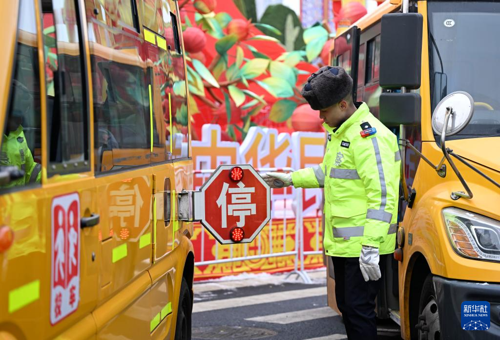 2月27日,新疆乌鲁木齐市公安局交通管理支队水磨沟区大队民警检查校车外观。新华社记者 王菲 摄