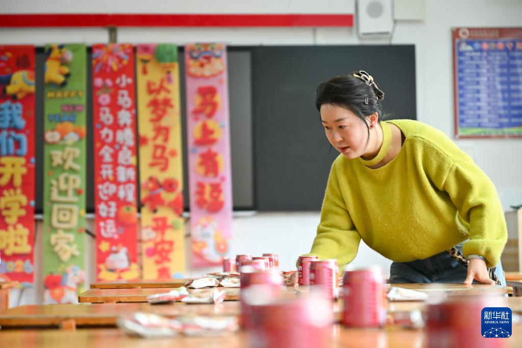2月27日,老师在贵州省开阳县第一小学布置教室。新华社发(袁福洪摄)