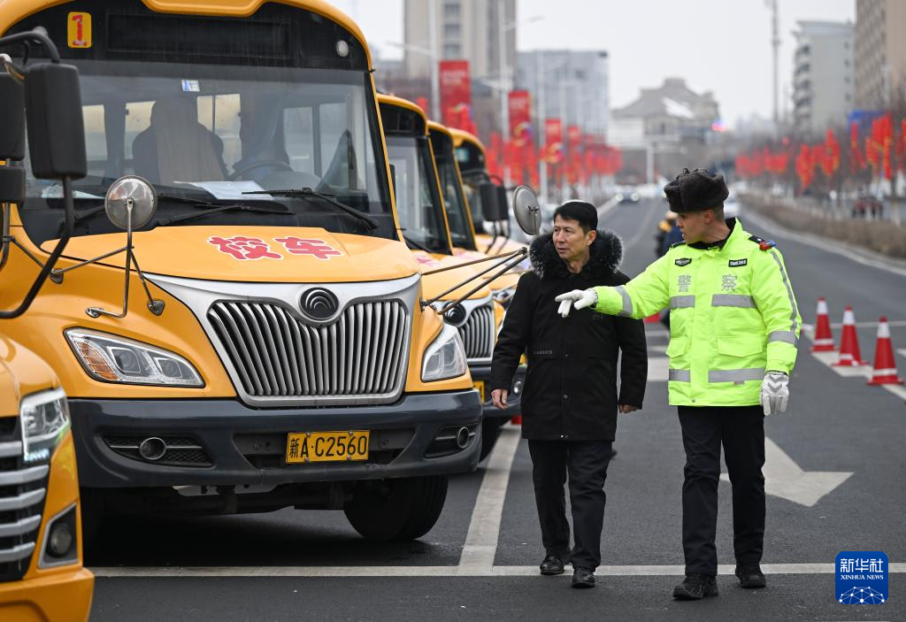 2月27日,新疆乌鲁木齐市公安局交通管理支队水磨沟区大队民警(右)在检查校车外观。新华社记者 王菲 摄