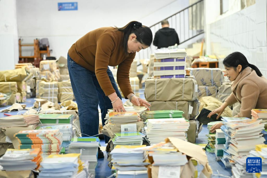 2月27日,工作人员在贵州省开阳县第一小学整理分发教材。新华社发(袁福洪摄)