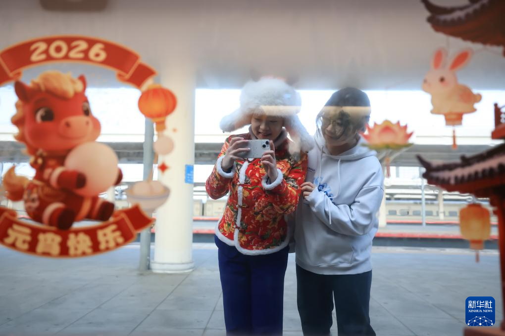 3月1日,旅客在齐齐哈尔站站台上拍摄G1280次列车上的元宵节装饰。 新华社发(徐率摄)