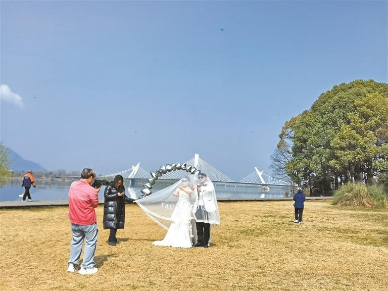 3月5日,市民在汉中市天汉湿地公园拍婚纱照。 记者 杨露雅摄